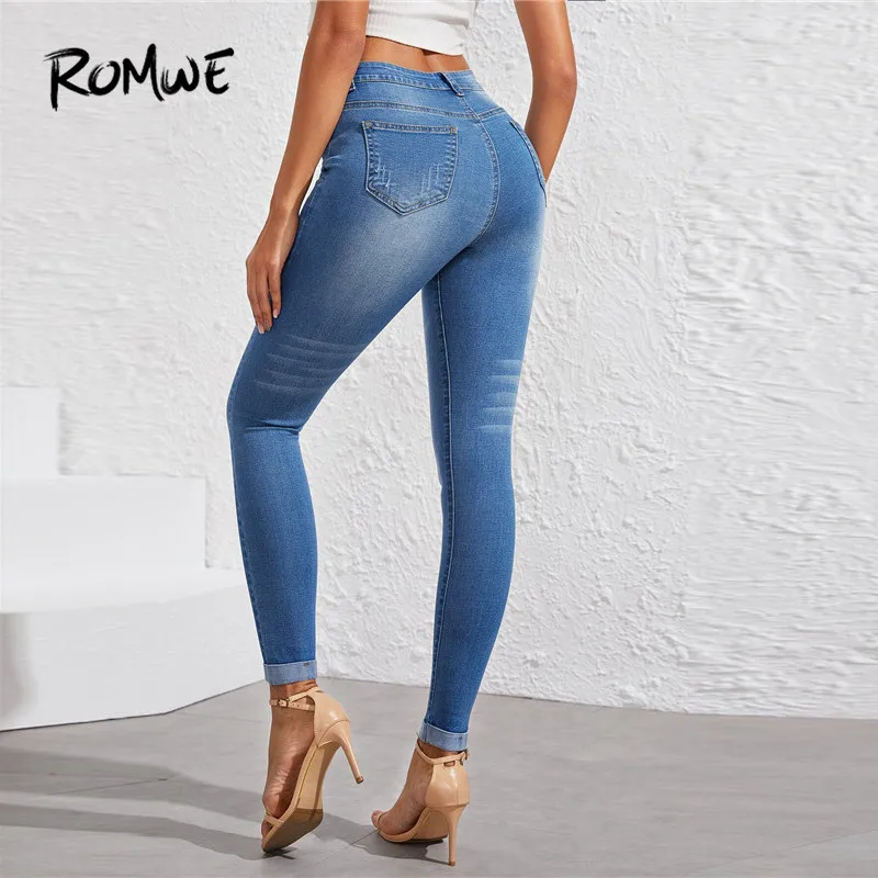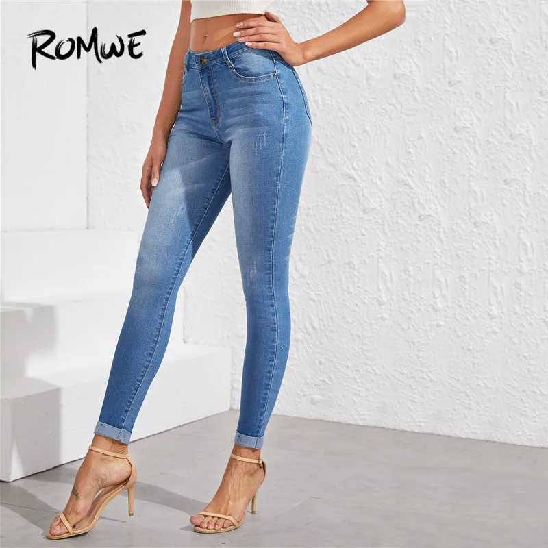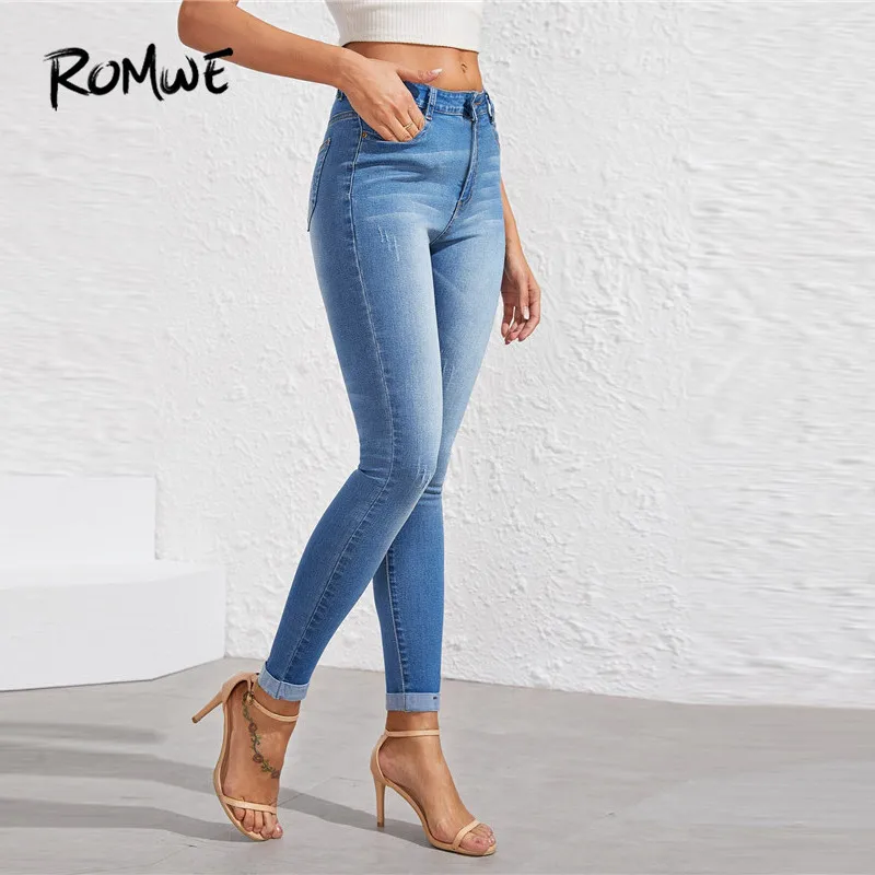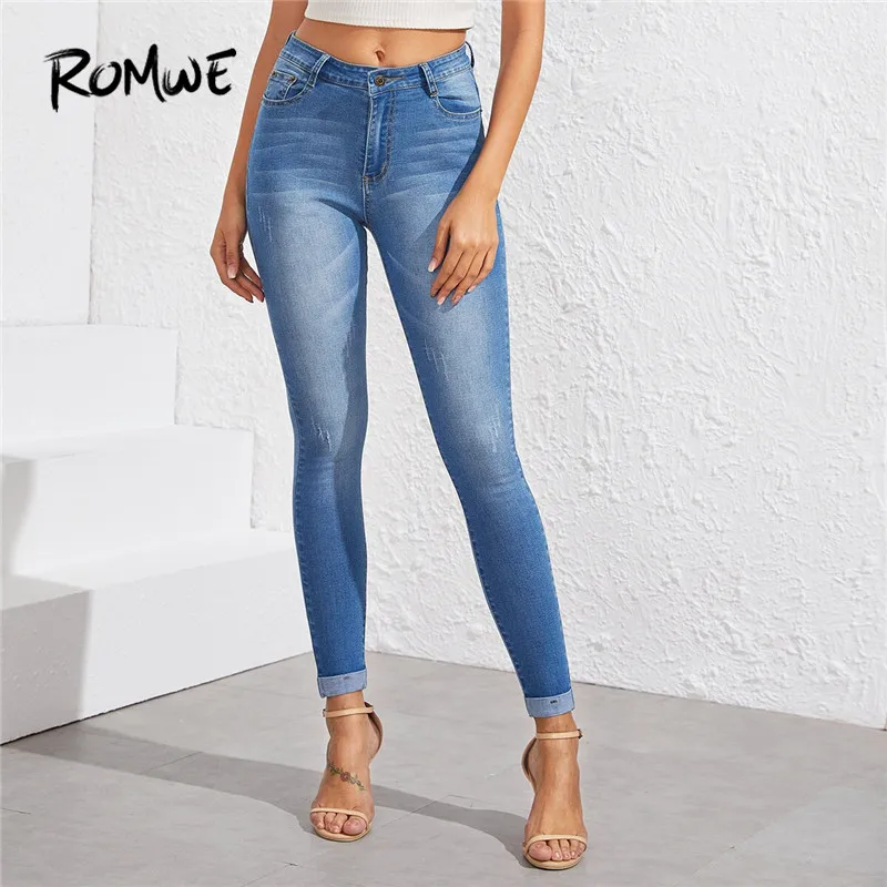 Promo ROMWE Blue Washed Cuffed Hem Skinny Jeans Woman Casual Denim Jeans Spring Fall 2019 Clothes Female Solid High Waist Jeans